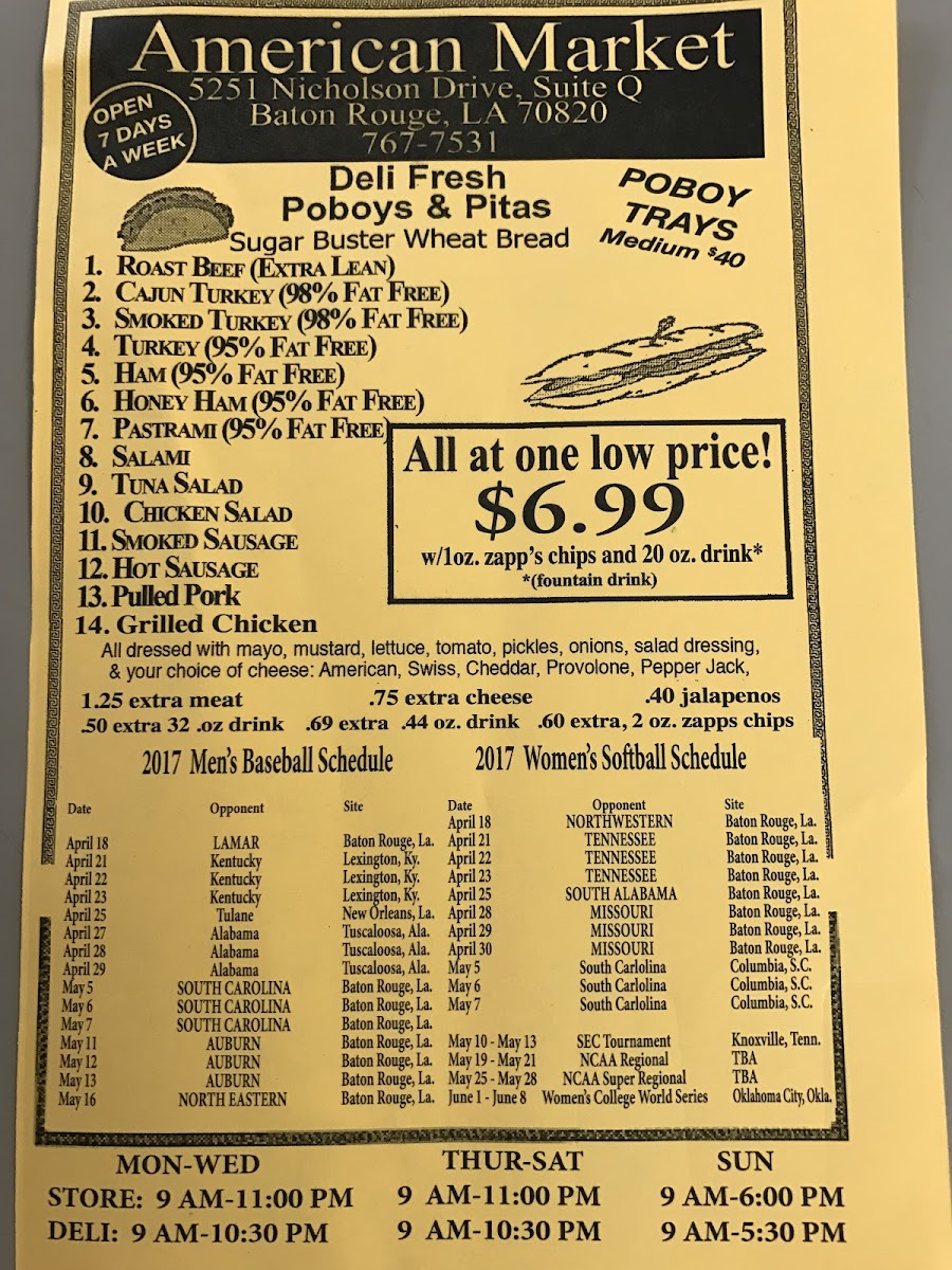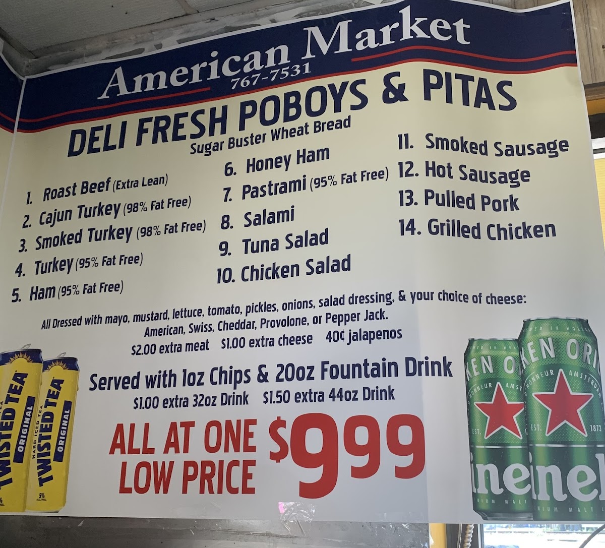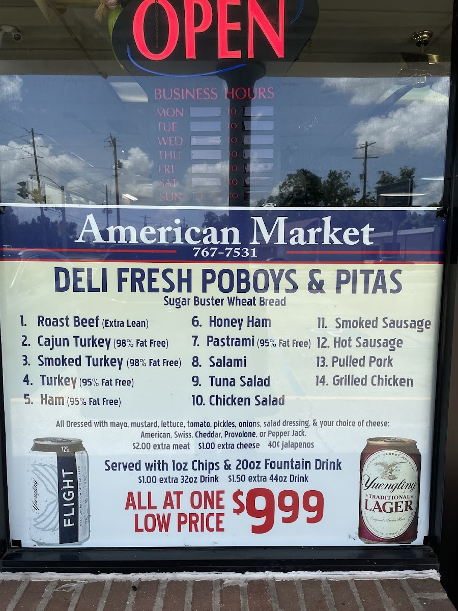 The menu at American Market reflects a straightforward, comforting deli style that suits casual meals and quick bites throughout the day. You’ll find a range of freshly made sandwiches, including classic Po' Boys and pita options, each crafted with lean, quality deli meats and traditional flavors typical of Baton Rouge’s local palate.